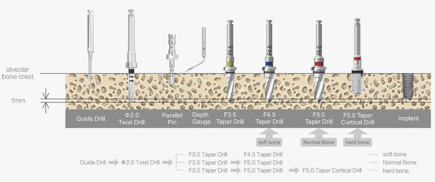 • Hard Bone (D1): Use taper cortical drill specifically designed.